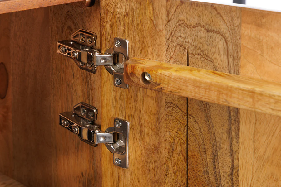 Solidna konstrukcja oparta na wytrzymałych, metalowych nogach w kolorze czarnym, zabezpieczonych metodą proszkową, zapewnia stabilność mebla oraz trwałość na lata. Komoda PANK wyposażona została w pojemne półki z praktycznym bezuchwytowym systemem otwierania, co umożliwia komfortowe przechowywanie różnorodnych przedmiotów codziennego użytku. Naturalne drewno mango, z którego wykonano komodę, sprawia, że każda egzemplarz jest unikatowy, z delikatnymi różnicami w kolorze i teksturze.