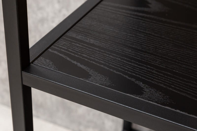 Regał SEKEND został zrobiony z wytrzymałego metalowego szkieletu oraz trzech mniejszych i dwóch większych półek z MDF ozdobionych okleiną w kolorze jesionu. Metalowa konstrukcja została pomalowana proszkowo na czarno.