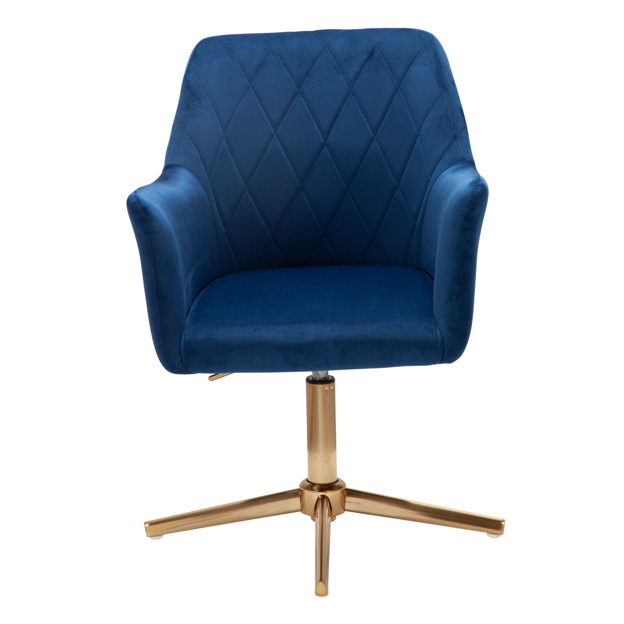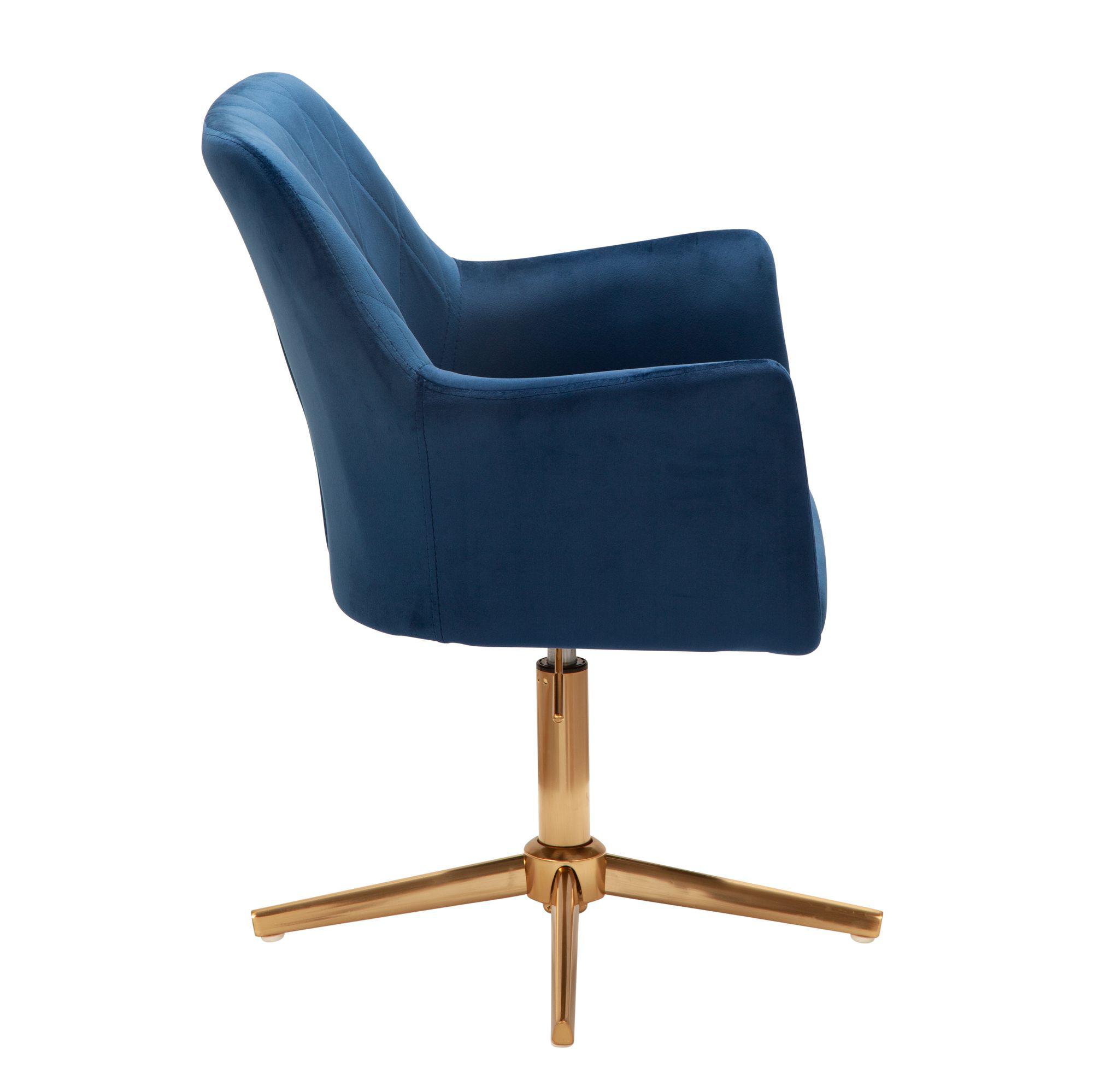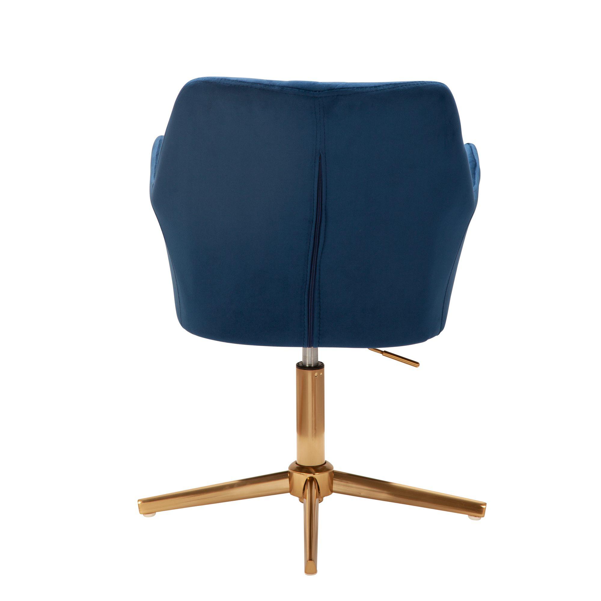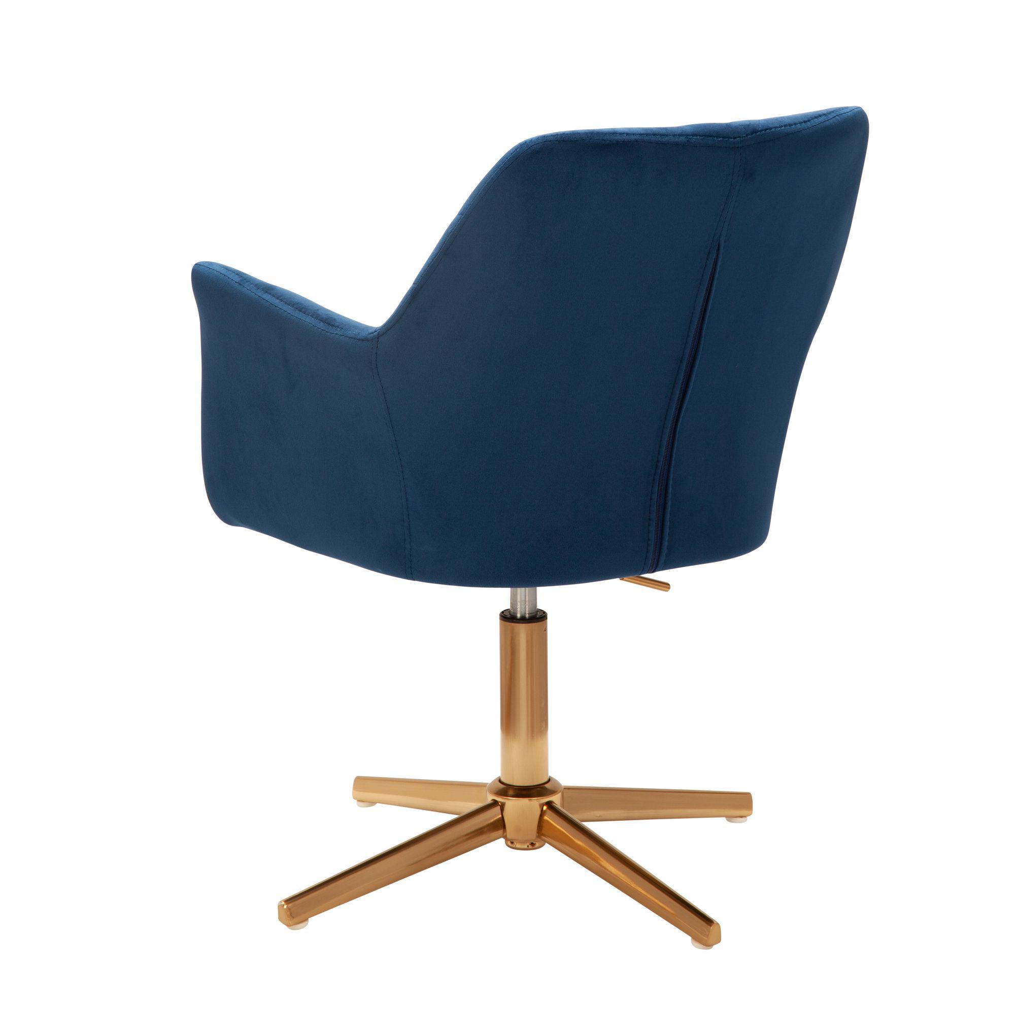 Tapicerowany obrotowy fotel z aksamitu glamour w pełnym wytworności i elegancji kolorze niebieskim na solidnej złotej, czteroramiennej podstawie