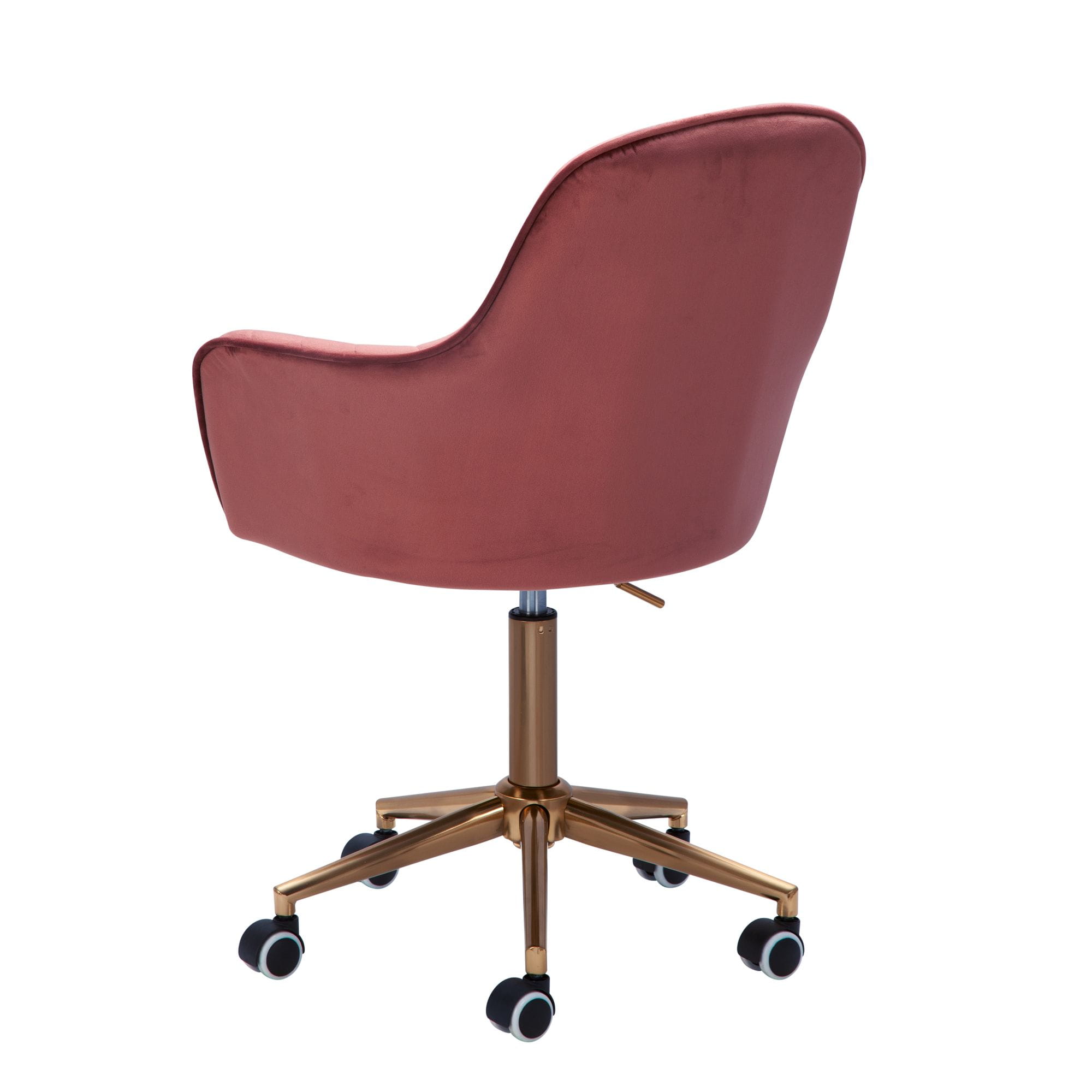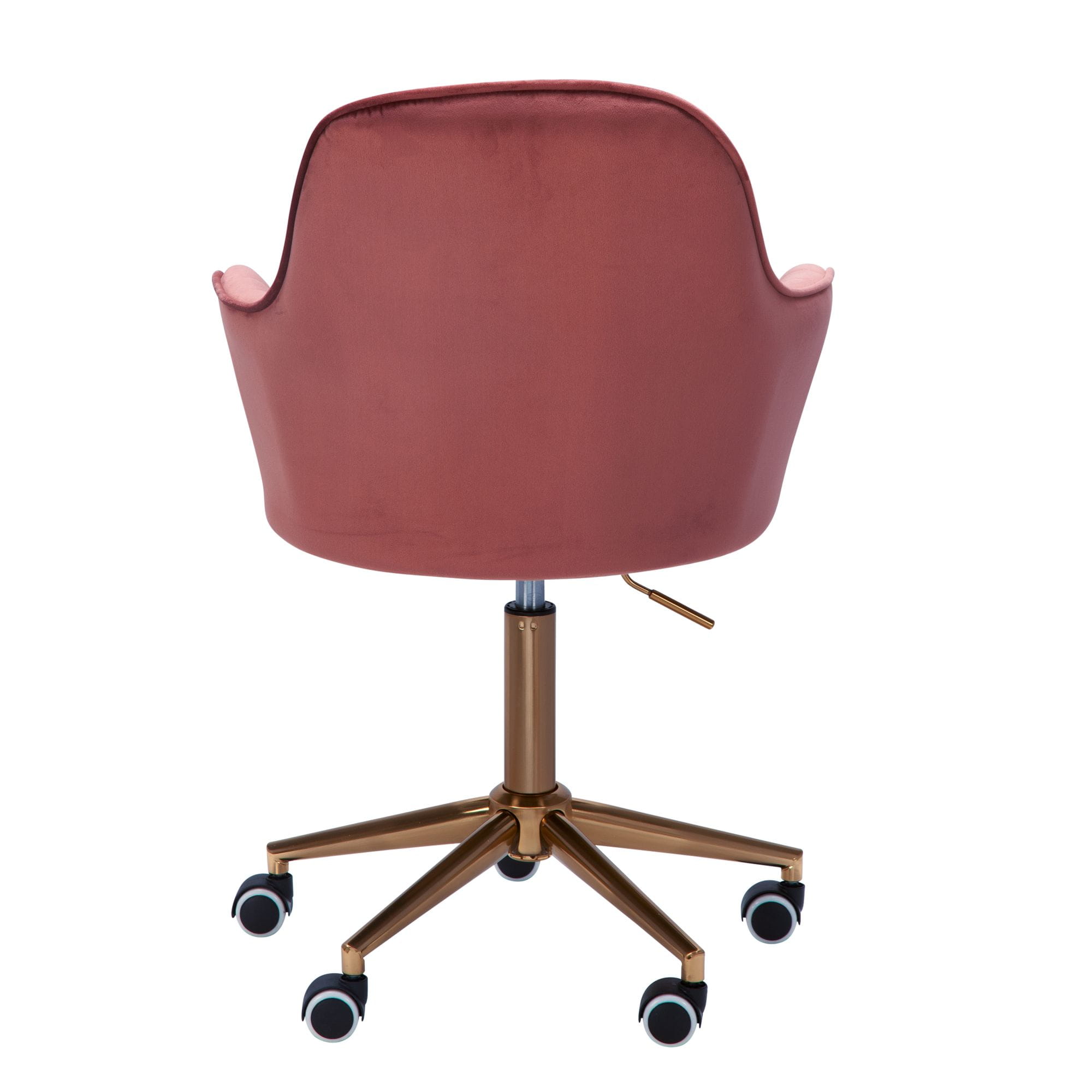 Tapicerowany fotel obrotowy z aksamitu w kolorze różowym na złotej podstawie na kółkach