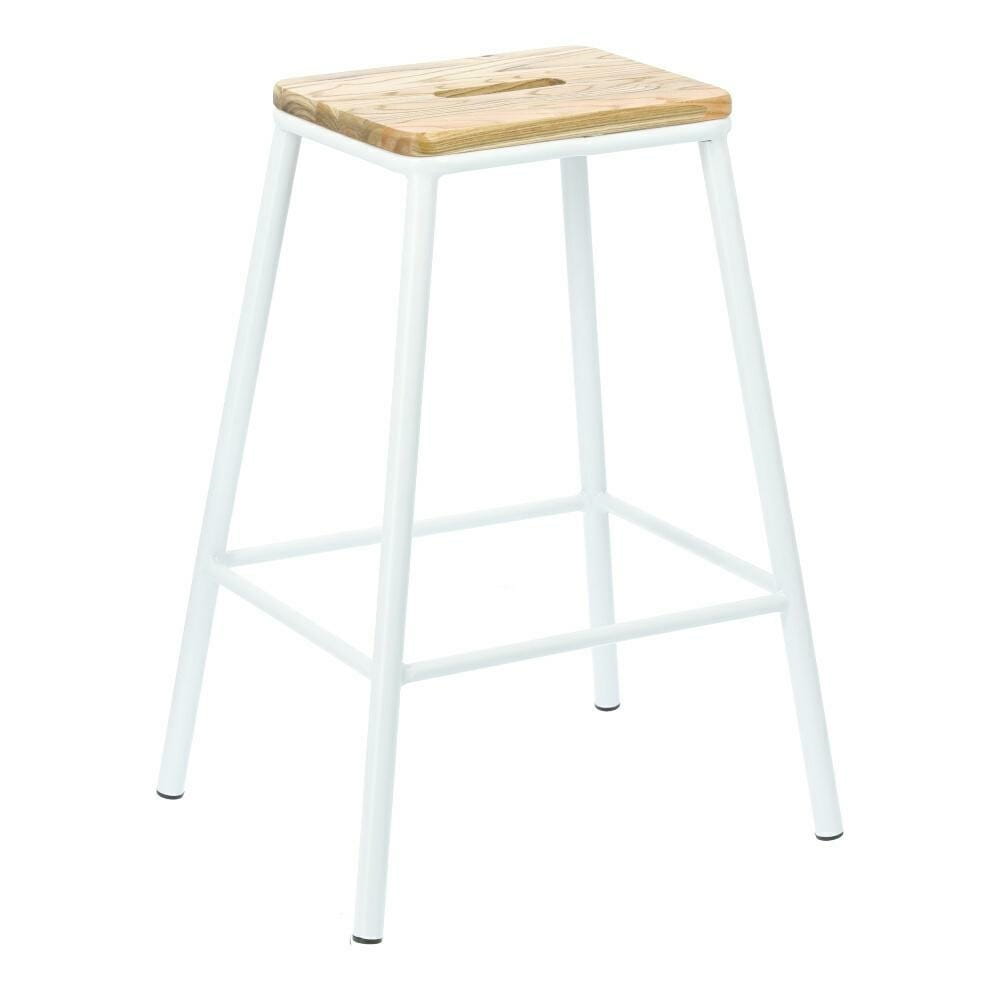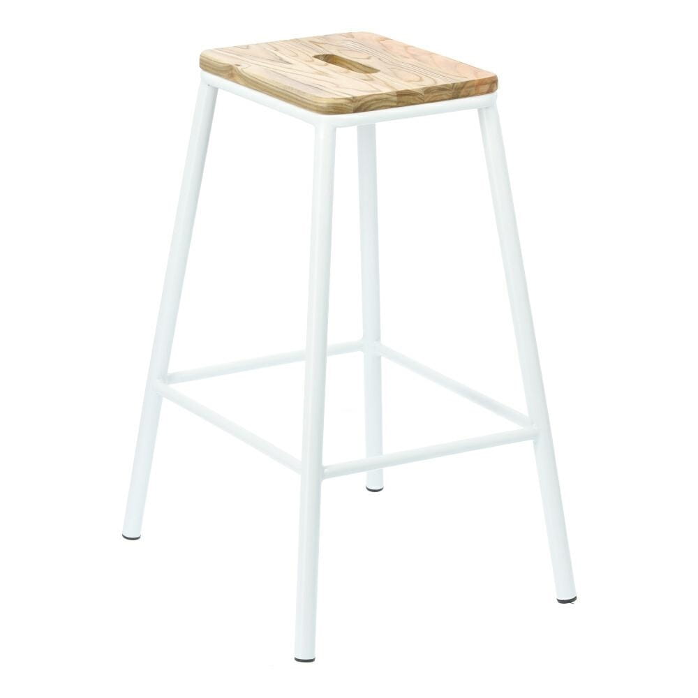 Stołek barowy został zrobiony z prostokątnego sosnowego siedziska oraz metalowej pomalowanej na biało podstawy. Stołki sztaplują się.