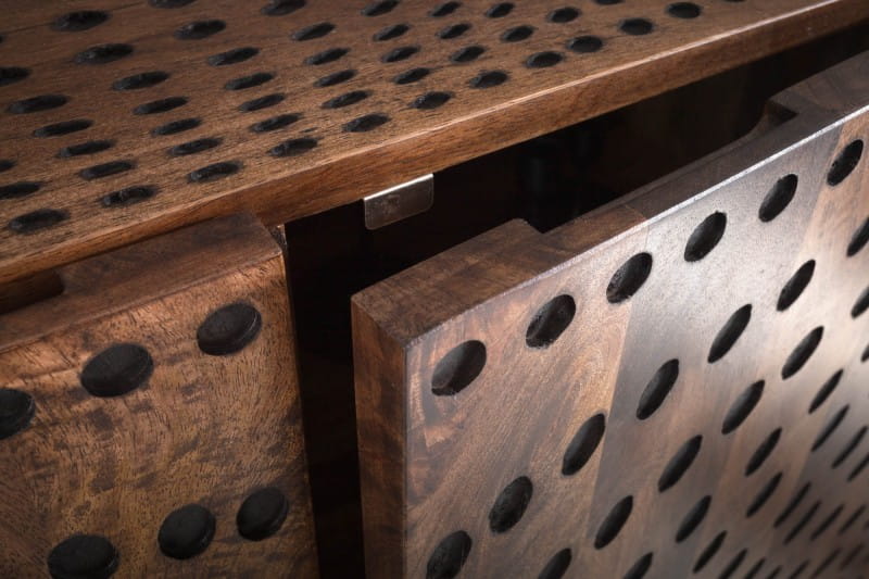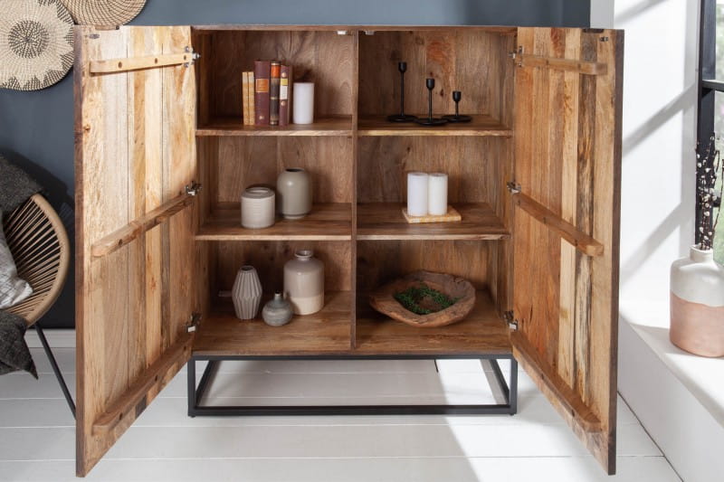 Produkt ten powstał z połączenia dwóch wyjątkowych surowców. Cały korpus wykonany został z naturalnego drewna mango, materiału wytrzymałego, trwałego, nie absorbującego wilgoci oraz o egzotycznym rysunku słojów i pięknym kolorze. Ozdobne fronty prezentują się bardzo oryginalnie, skupiając na sobie uwagę i z miejsca stając się ciekawą ozdobą. Podstawa zrobiona jest z metalu w kolorze czarnym, stylowo podkreśla charakter komody a przy tym gwarantuje solidność i stabilność. Decydując się na zakup modelu MATRIX zyskasz: