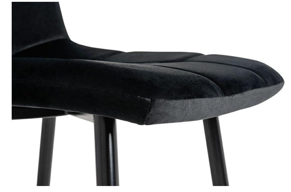 Produkt prezentuje się surowo i elegancko, podbijając z miejsca standard każdego wnętrza w jakim się znajdzie. Użyte do jego wykonania materiały są naprawdę wysokiej jakości, co daje nam gwarancje na jego trwałość i wytrzymałość, a co za tym idzie bezpieczeństwo. Siedzisko zostało wyprofilowane dla jak największego komfortu, obite pięknym i odpornym na wiele czynników, czarnym welurem. Cztery nogi zrobione są z mocnego metalu również w czarnej barwie. Całość to ponadczasowy, sprawdzony trend, który będzie modny przez długie lata. Decydując się na ten model zyskasz: