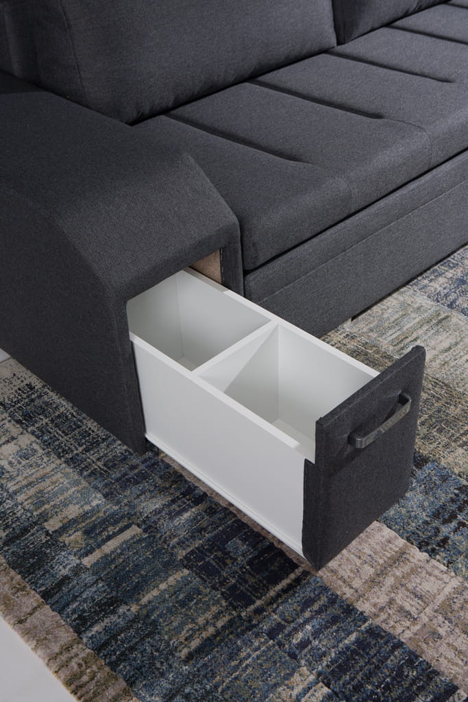 Idealny mebel wypoczynkowy po pierwsze świetnie wygląda a po drugie daje nam dodatkowe miejsce do spania. Nowoczesny narożnik AV4 jest funkcjonalnym elementem wyposażenia, zaprojektowanym z myślą o komforcie podczas odpoczynku ale też będącym szykowną ozdobą wnętrza. Wykonany został z wytrzymałych, trwałych materiałów, a wszystkie rozwiązania jakie w nim zastosowano maja tylko jeden cel- jak największe zadowolenie użytkownika. Dodatkowym atutem jest barek oraz pufa dołączone do niego. Pojemnik na pościel daje nam dodatkowe miejsce do przechowywania, co zawsze jest pożądaną opcją. Decydując się na zakup rozkładanego narożnika AV2 zyskasz: