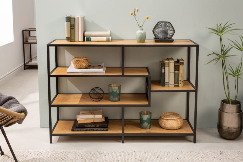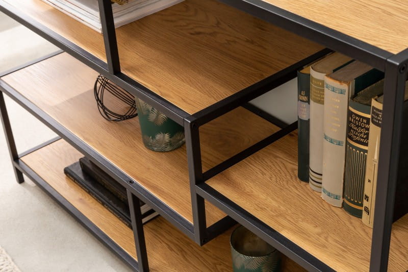 Regał SEKEND idealnie wkomponuje się w minimalistyczne oraz loftowe wnętrza. Półki wykonane z płyty MDF wykończonej laminatem w kolorze dębu doskonale łączą sie z metalową ramą malowaną proszkowo na kolor czarny.