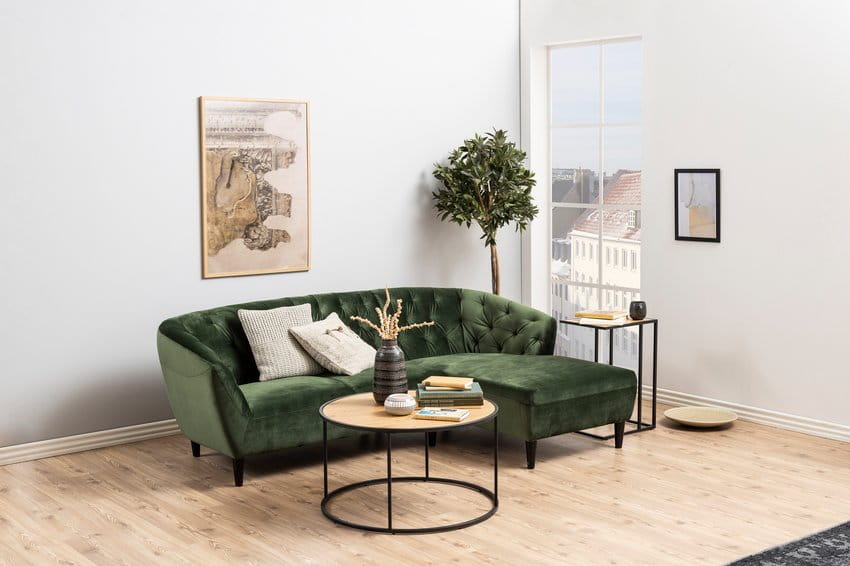 Stolik Secret Loft od polskiej marki StrongTree.pl. Blat wykonany z MDF w dębowym fornirze. Został umieszczony na czarnej metalowej podstawie.