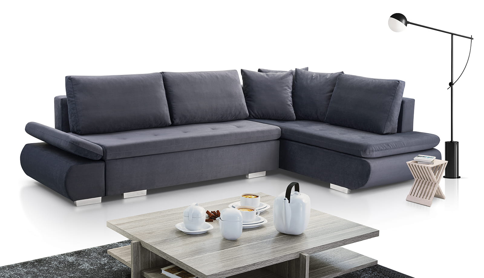 Stylowy narożnik L z funkcją spania i plastikowymi nóżkami, wybór kolorów AV14