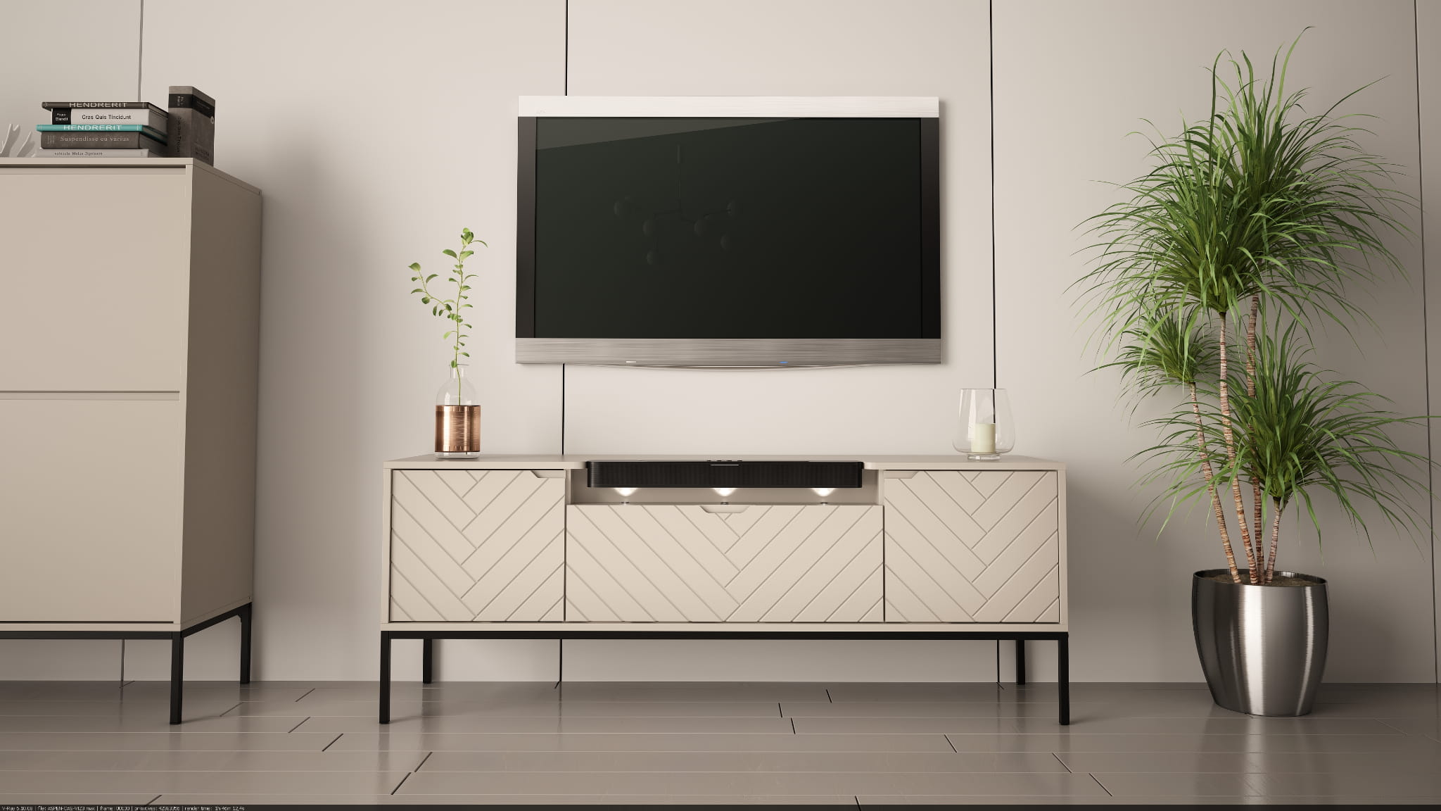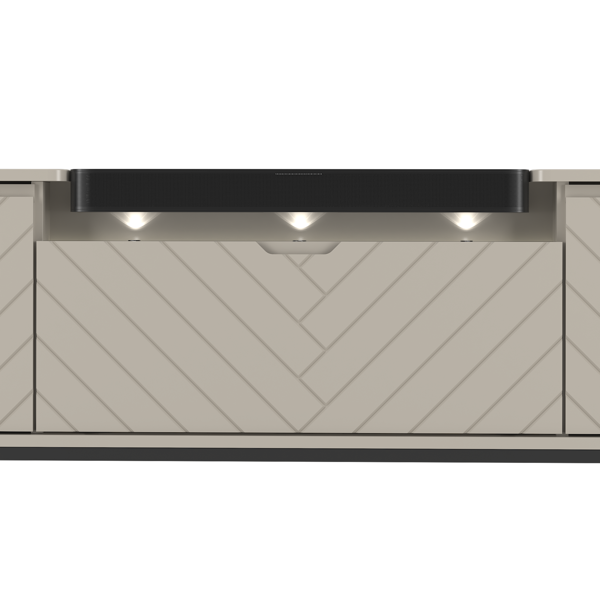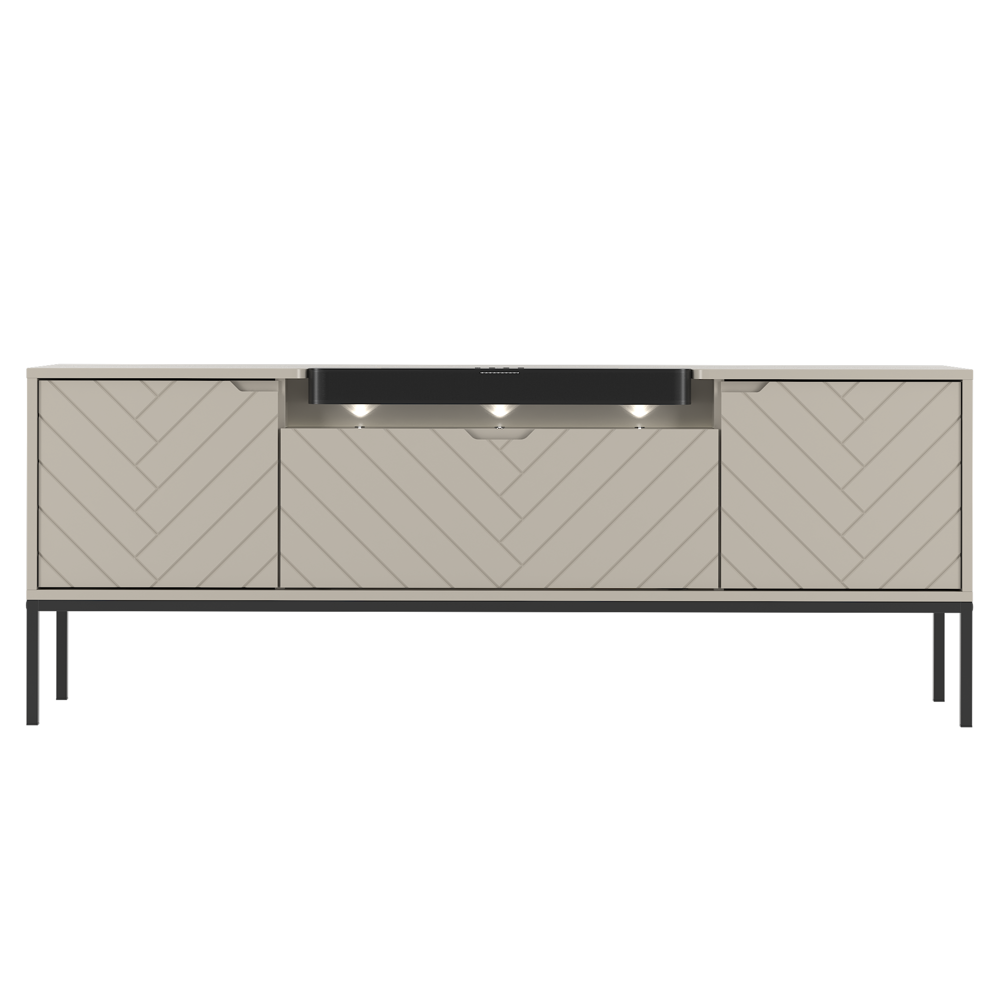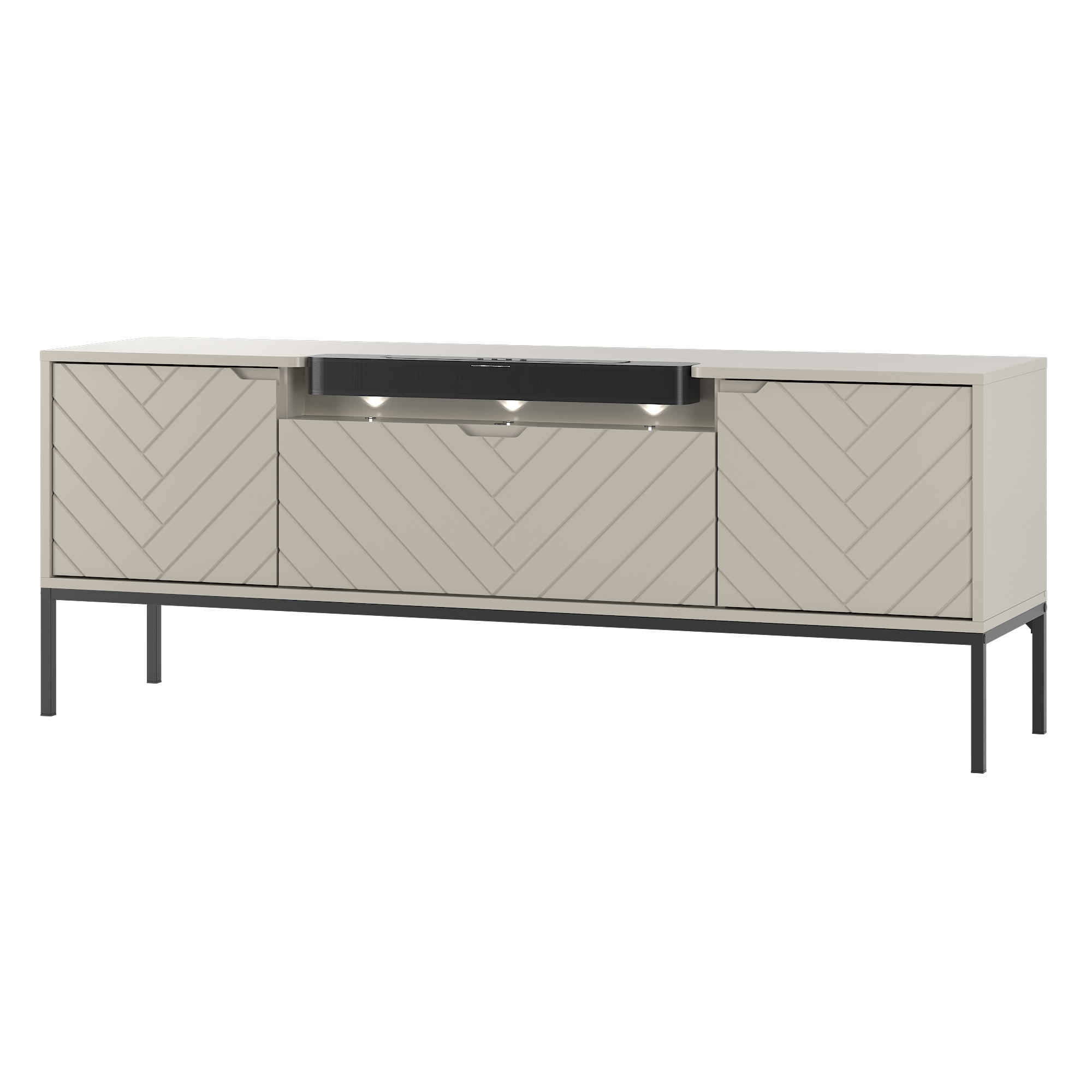 Szafka RTV z soundbarem JBL, beżowe fronty w jodełkę, metalowe nogi 57/151 cm ALDA