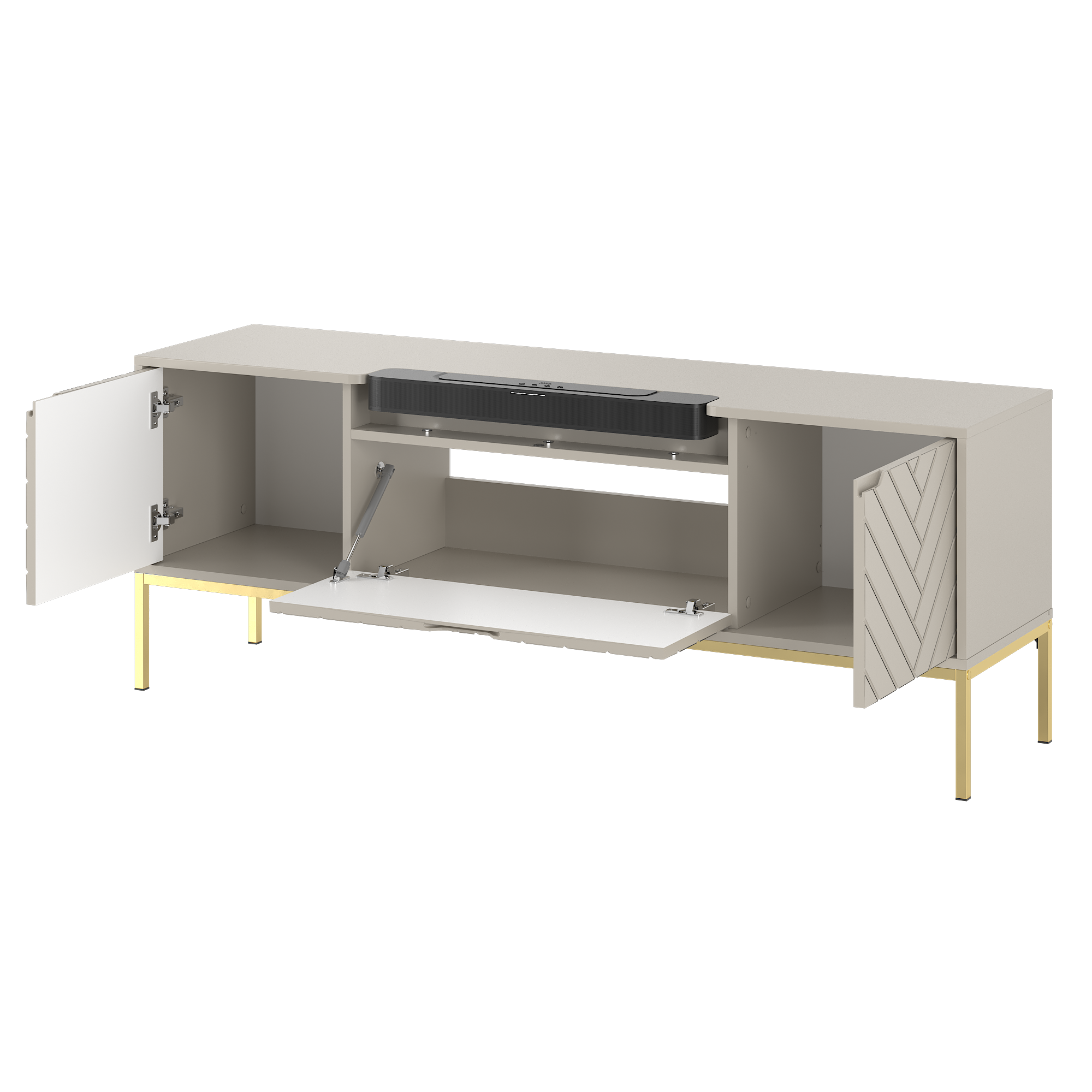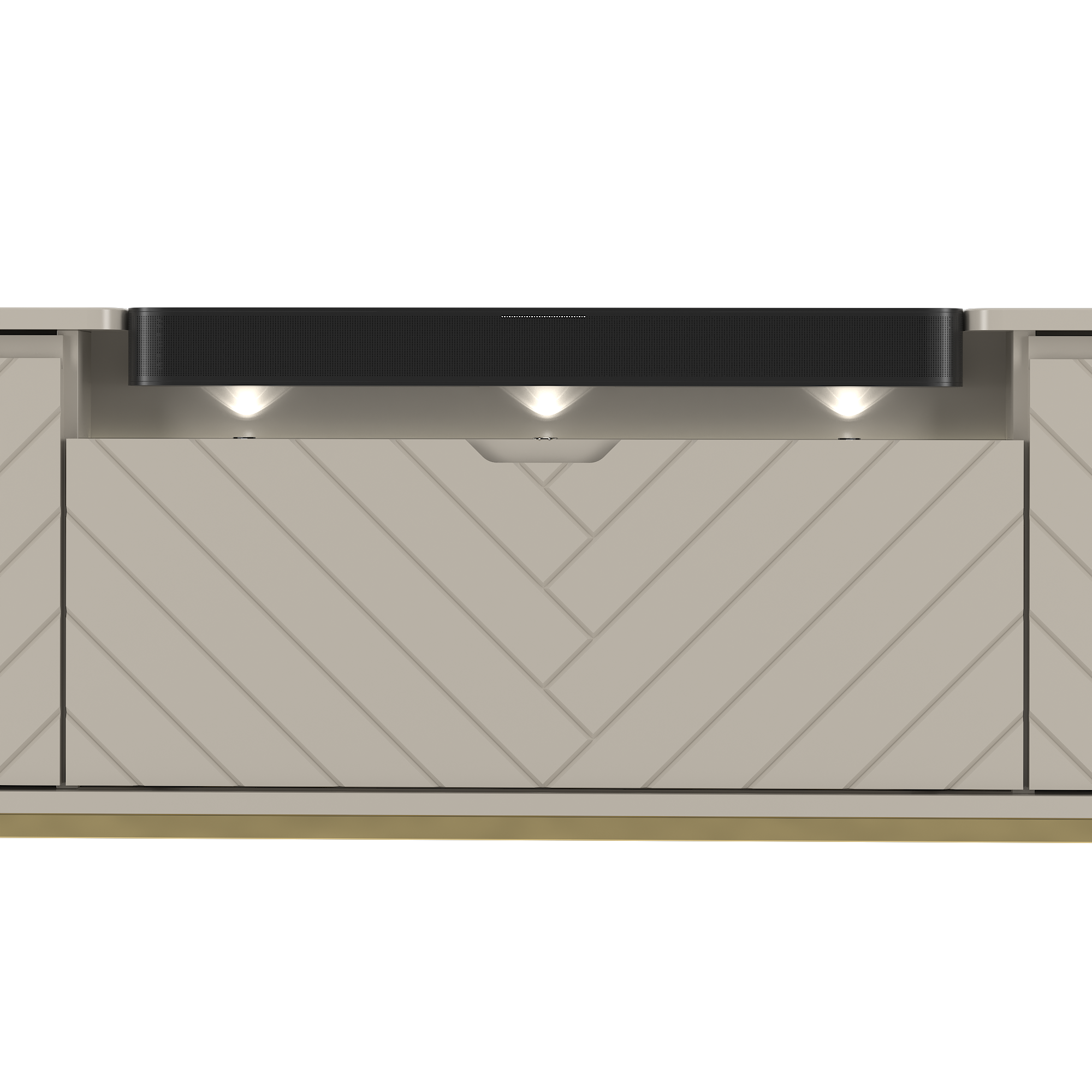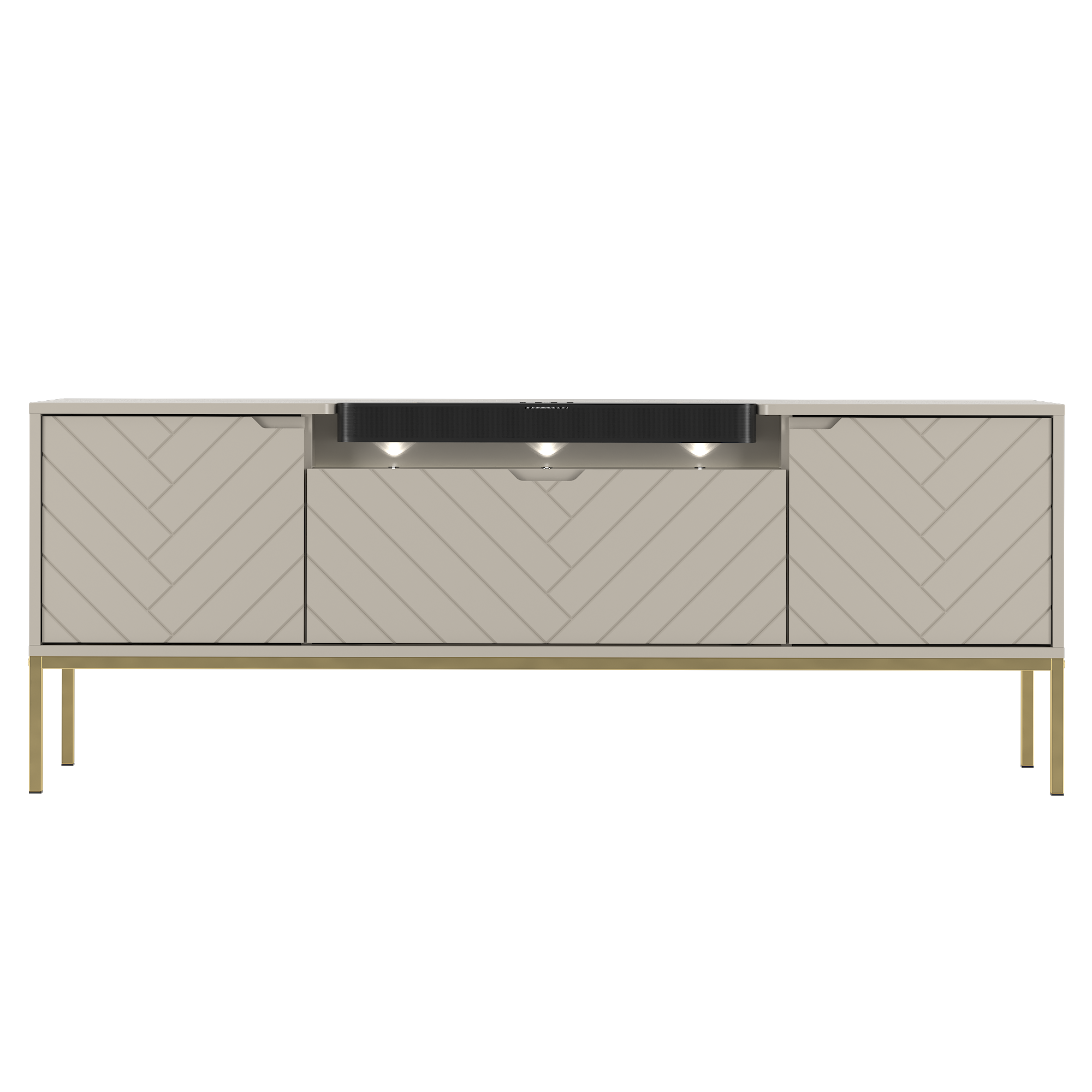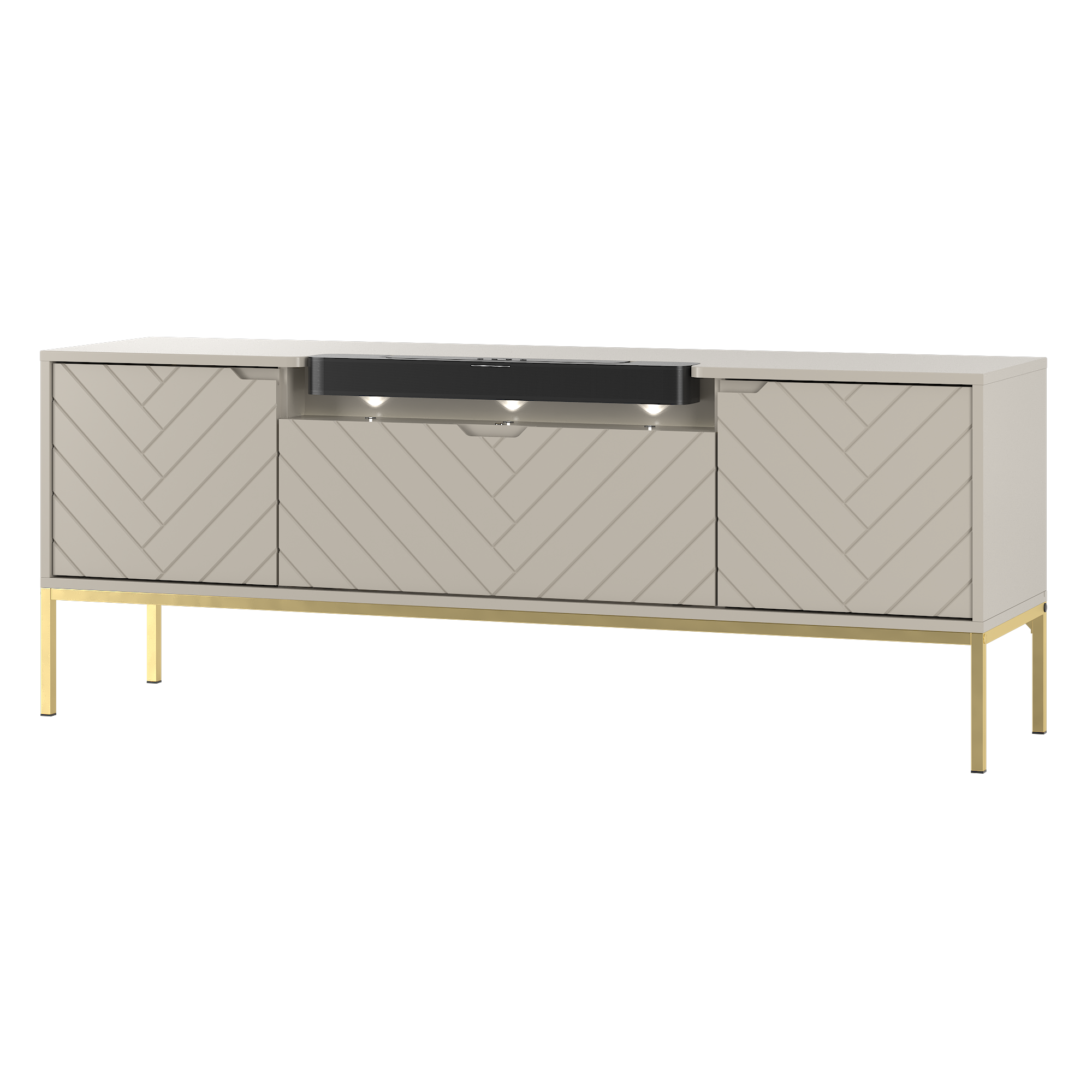 Szafka RTV z soundbarem JBL, beżowe fronty w jodełkę, na złotych nogach 57/151 cm ALDA