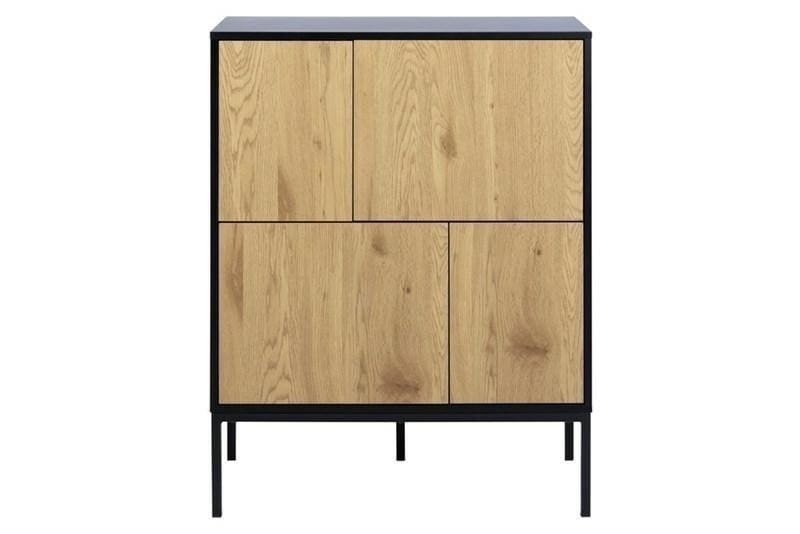 Korpus wykonany został z płyty MDF w kolorze czarnym, w matowym wykończeniu, fronty to płyta meblowa w okleinie dębowej (kolor „wild oak”), nogi to natomiast metal malowany proszkowo na kolor czarny.
