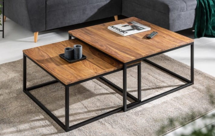 Zestaw kwadratowych stolików, blat drewno sheesham metalowe czarne nogi