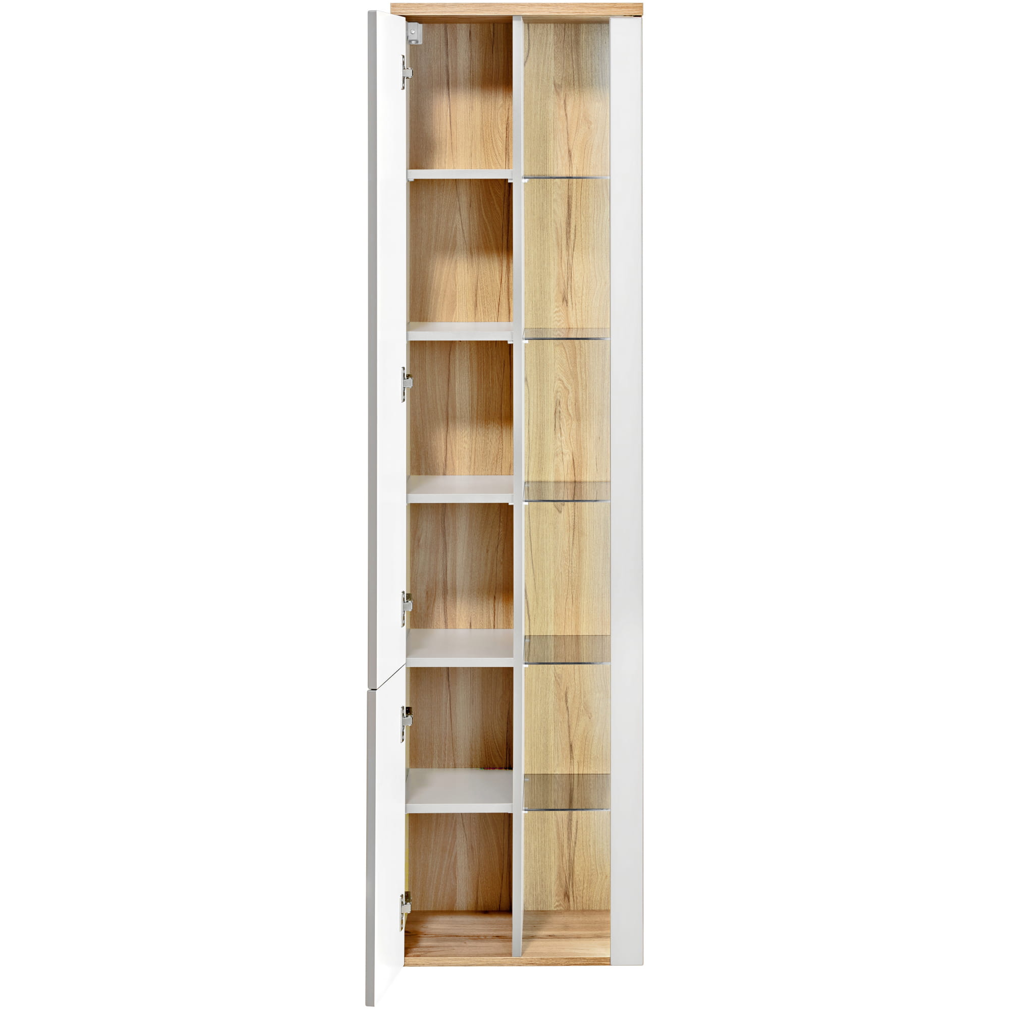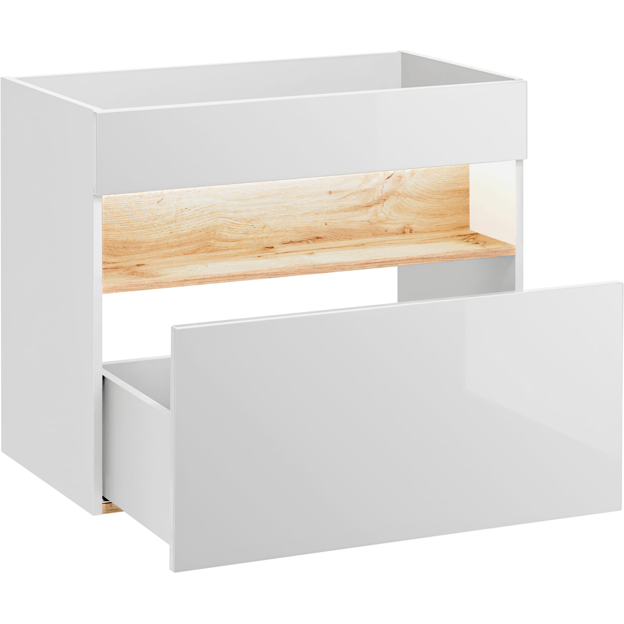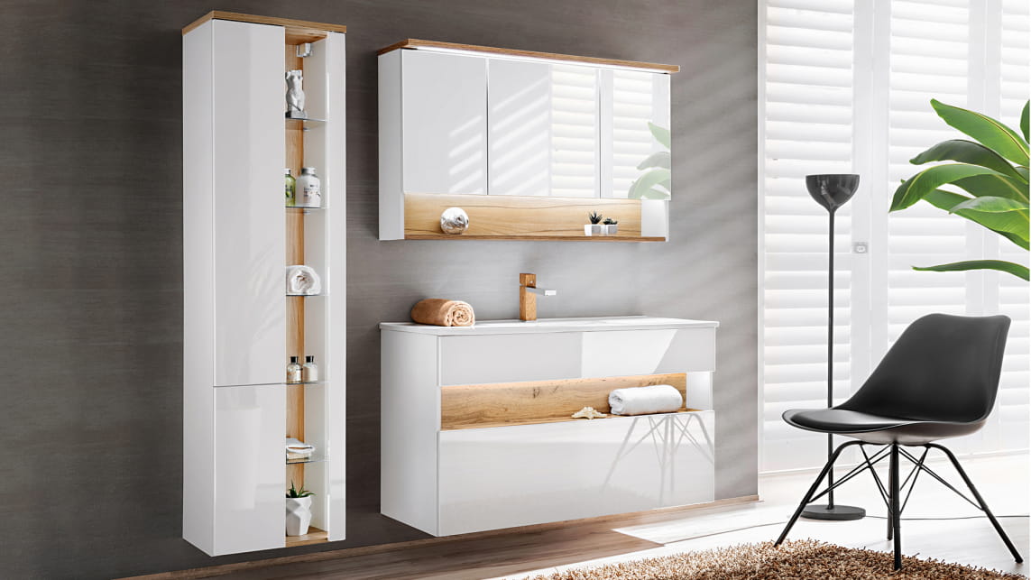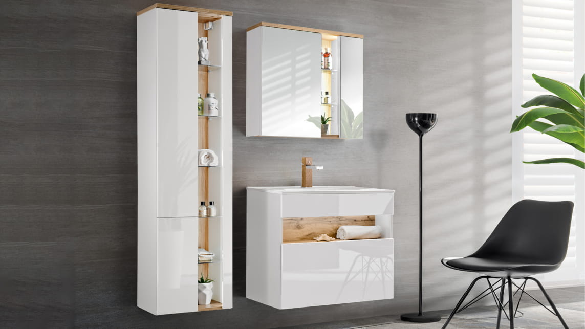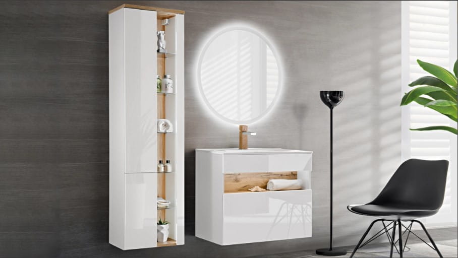 BOSTON YOUNG White to nie tylko niezwykle elegancka, ale również stylowa kolekcja mebli łazienkowych. Zestaw składa się z niskiej szafki pod umywalkę w dwóch wariantach, szafki z lustrem oraz wysokiej szafki z otwartymi, szklanymi półkami, które doskonale eksponują stylowe dodatki i akcesoria. Wszystkie drzwiczki posiadają system cichego domyku. Szafki BOSTON YOUNG mogą być zamontowane na ścianie, co pozwala uzyskać zachwycający efekt, a dodatkowo ułatwia utrzymanie czystości w łazience. Serię dopełnia okrągłe lustro Rossi z podświetleniem LED, które dodaje nowoczesnego charakteru. Białe, laminowane fronty w połączeniu z drewnem w ciepłym odcieniu tworzą klimat eleganckiego SPA. Seria ta zachwyci nawet najbardziej wymagających miłośników minimalizmu w eleganckim wydaniu.